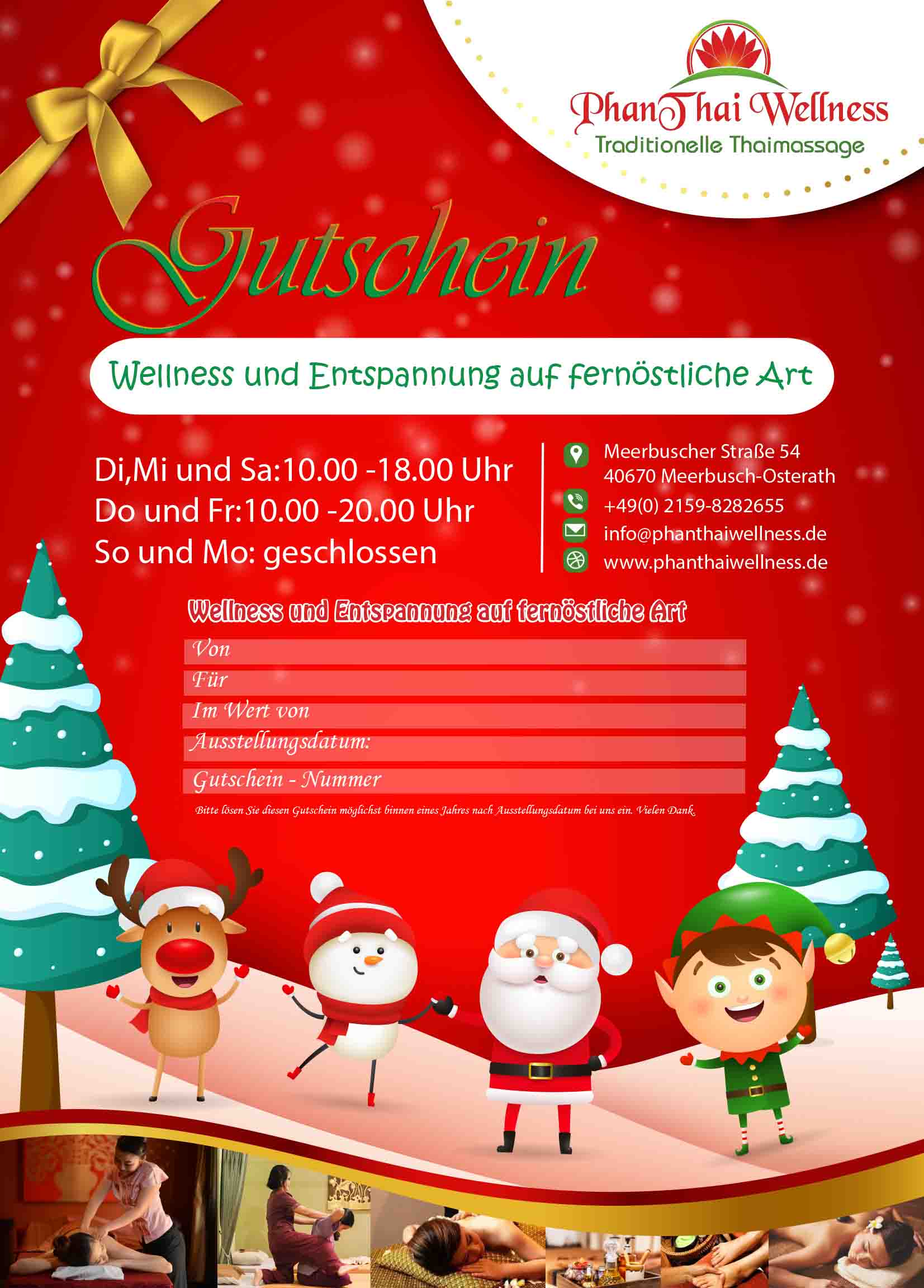 Und wenn Sie den Gutschein einmal nicht persönlich übergeben wollen oder können, schicken wir Ihn auf Wunsch natürlich auch als JPG-Datei an die E-Mail Adresse des Käufers oder des zu Beschenkenden. Jede Anwendung auf unseren Gutscheinen kann vor Ort problemlos gegen andere als die auf dem Gutschein angegebene Anwendungen eingetauscht werden. Gegebenenfalls ist eine Zuzahlung erforderlich. Eine Barauszahlung von Restguthaben ist nicht möglich und wird diesbezüglich in Form eines Gutscheins rückerstattet.